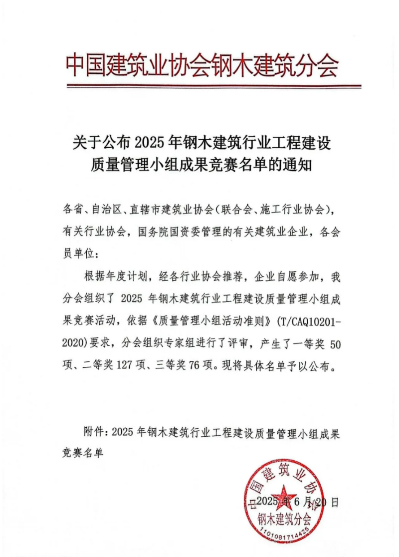 長期以來,中建材鋼構始終將質量管理視為企業發展的生命線,積極引入先進質量管理理念與方法。此次競賽佳績的取得,是中建材鋼構公司堅持質量優先發展戰略的有力印證。這些獲獎成果不僅將為公司創造顯著的經濟效益,更將在行業內發揮示范引領作用,提升鋼木建筑行業質量管理的整體水平。未來,中建材鋼構公司將持續深化質量管理創新,不斷提升工程質量水平,為客戶提供更加優質的產品與服務,為推動鋼木建筑行業高質量發展貢獻更多力量。